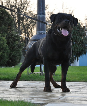 Quinten von der Scherau (Квинтен фон дер Шерау) принадлежит известному и одному из старейших питомников Германии von der Scherau. Квинтен очень востребован как производитель не только в Германии, но и в мире. И не только благодаря своему выдающемуся происхождению: Квинтен является сыном Победиля главной выставки Германии Klubsieger ADRK 2008 - Danjo von der Tonberger Hohe. В его родословной собраны самые известные и знаковые ротвейлеры современности: Mambo von der Crossener Ranch, Rick von Burgthann, Eros von der Burg Weibertreu и другие. Также ценно, что Квинтен обладает отличным экстерьером и здоровьем: свободен от дисплазии тазобедренных и локтевых суставов (HD-frei, ED-frei), прошел тест на выносливость AD. У Квинтена великолепные рабочие качества (норматив VPG 3), характер и темперамент. И самое главное, все свои достоинства и лучшие черты Квинтен передает своим детям.